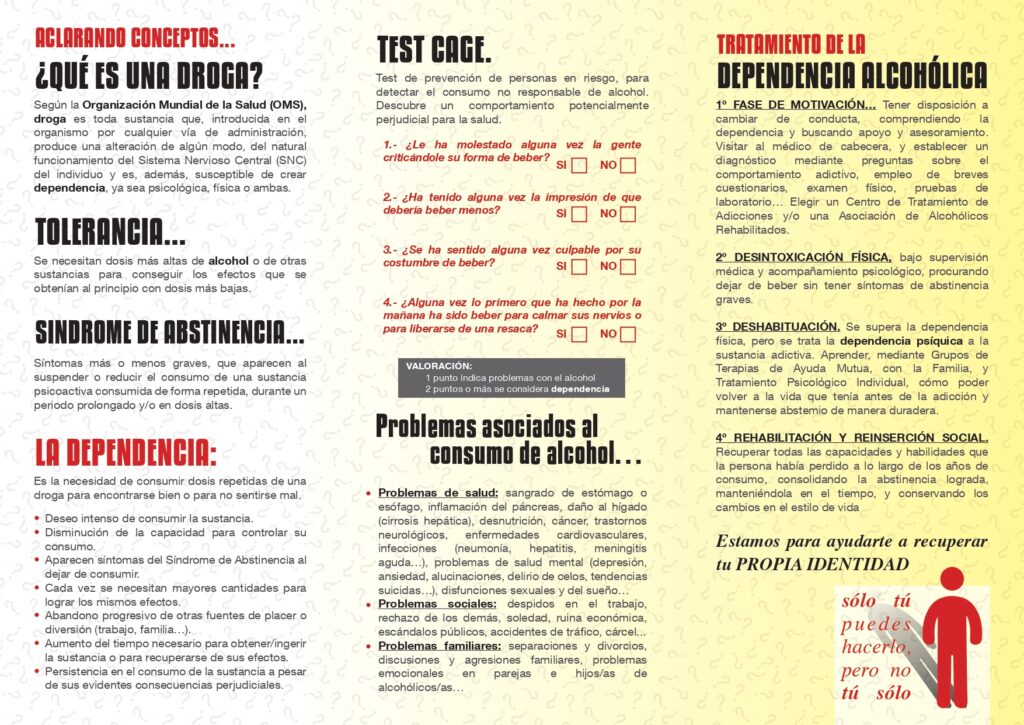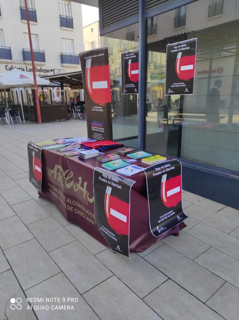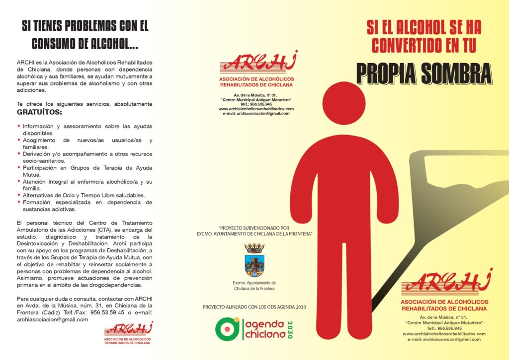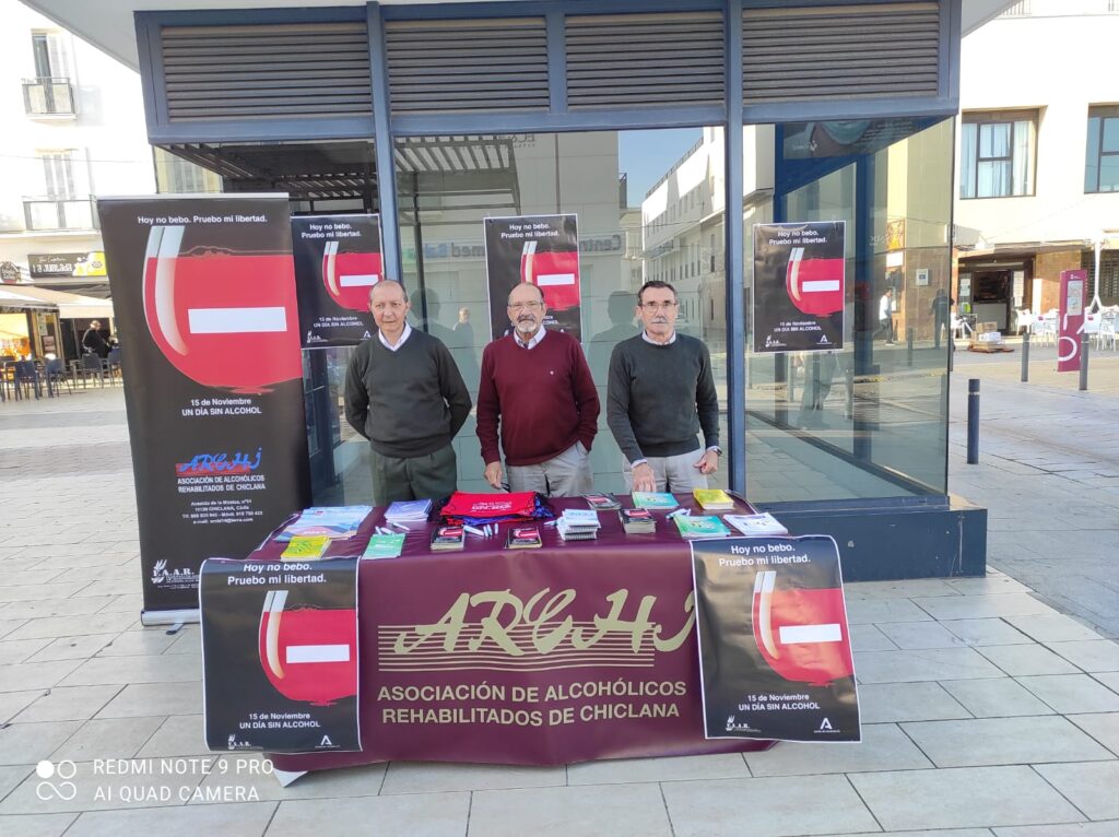 La Asociación ARCHI atiende a hombres y mujeres que han desarrollado la dependencia alcohólica, así como los problemas que arrastra, siendo de suma importancia la implantación de programas, como el subvencionado por el Excmo. Ayuntamiento de Chiclana de la Fra., «Proyecto de Formación y Sensibilización CUIDA TU LIBERTAD», desarrollado en nuestro entorno social más cercano, y que recoge, entre sus actuaciones, la Campaña «Día Mundial Sin Alcohol – 15 Nov.», conmemorándose varios actos referidos a la prevención del alcoholismo, principalmente, la instalación de un Stand Informativo para la sensibilización y visibilidad de la problemática, abordada en la vía pública de la localidad, concretamente, en la Plaza de las Bodegas de Chiclana Fra., durante la pasada mañana del sábado 19 de Noviembre de 2.022, repartiéndose material divulgativo sobre prevención y tratamiento de las adicciones, como el conocido Tríptico «Si el Alcohol se ha convertido en tu propia Sombra», transmitiendo el personal voluntario de la entidad, sus conocimientos, vivencias y experiencias acerca de la enfermedad. El objetivo era aumentar el nivel de información adquirida sobre alcoholismo y drogodependencias, a través de la sensibilización de los/as ciudadanos/as con respecto a este tipo de adicciones, apostando por el fomento de alternativas de ocio y tiempo libre saludables, en detrimento del recurso a sustancias y comportamientos adictivos.
