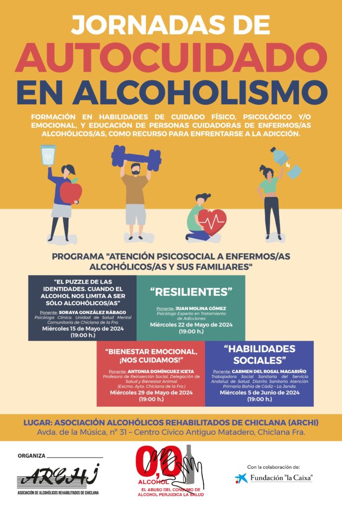 Nos complace invitarles a las «Jornadas de Autocuidado en Alcoholismo», que tendrá lugar todos los miércoles, en horario de tarde (19:00 h.), en las instalaciones de nuestra entidad Archi (Avenida de la Música, núm. 31, «Centro Municipal Antiguo Matadero»), en las que profesionales externos llevarán a cabo una formación en habilidades de autocuidado físico, psicológico/emocional y social, contando con la participación de Soraya González Rábago, Psicóloga Clínica; Juan Molina Gómez, Psicólogo experto en el tratamiento de las Adicciones; Antonia Domínguez Iceta, Profesora de Reinserción Social de la Delegación de Salud y Bienestar Animal (Excmo. Ayto. de Chiclana Fra.); y Carmen del Rosal Magariño, Trabajadora Social, Distrito Sanitario Atención Primaria Bahía de Cádiz – La Janda. Las Jornadas van destinadas a personas con dependencia alcohólica y/u a otro tipo de sustancias o comportamentales, sus familiares, así como aquellos/as interesados/as en las adicciones.